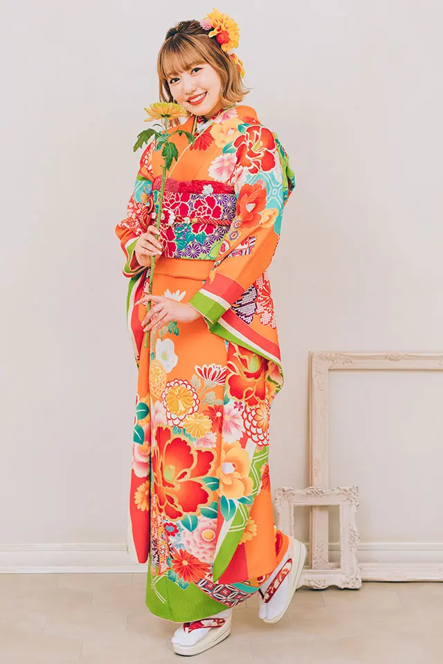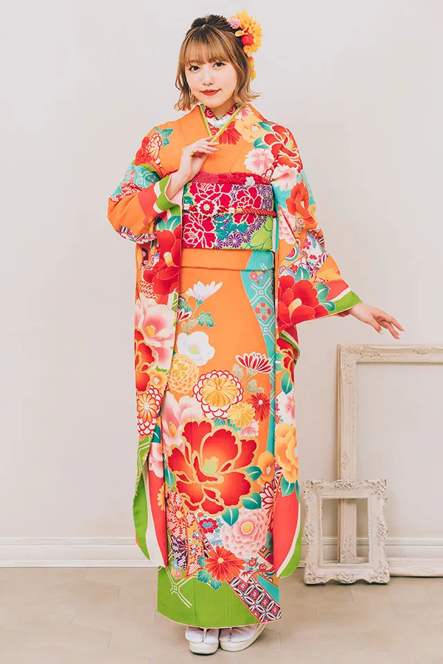 椿の花を主体に束ねのしと寛文調の菊をメインモチーフにしました。ベースのオレンジに両脇と袖の端に表現した3色ラインがカラフルでポップな印象です。※こちらの商品はお取り寄せとなります。詳しくは店舗へお問い合わせください。