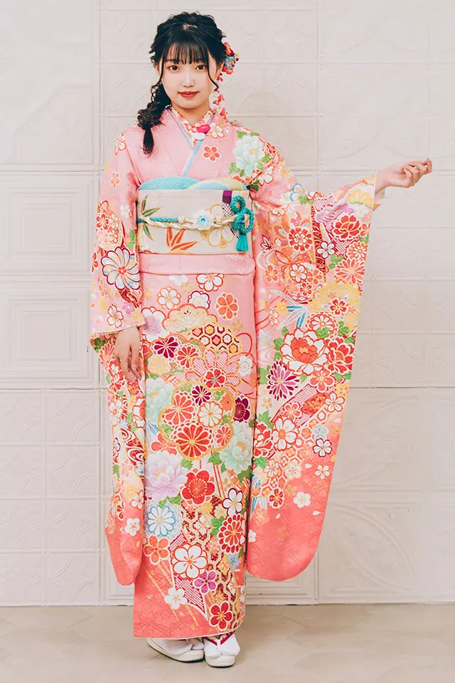 伝統的な吉祥文様と疋田柄を多用した古典柄に、やわらかなピンクの地色を基調にクリームぼかしを効かせ可愛らしく柔らかな印象の振袖に仕上げました。※こちらの商品はお取り寄せとなります。詳しくは店舗へお問い合わせください。