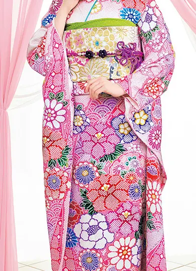 昔ながらの疋田・一目・小帽子を、現代の技術で疋田生地に表現しました。柄は吉祥文様の熨斗目に大輪の牡丹・菊・梅を淡い色調で染めた上品な振袖です。