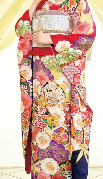 大きな鼓と全体に散らした紅白の梅の花がポイントです。鼓の中に菊・橘などの花々や青海波・亀甲・花菱を描き、背景に流水・七宝・花々を描いた亀甲を配した大変豪華な古典振袖です。