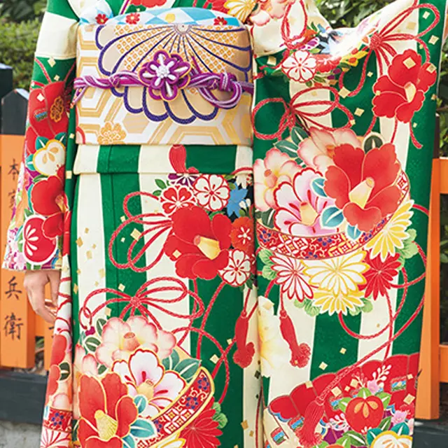 椿の花をモチーフに花鈴を描き、地には緑と白のストライプでモダンさを出しています。花鈴に施した金駒刺繍が豪華な印象です。