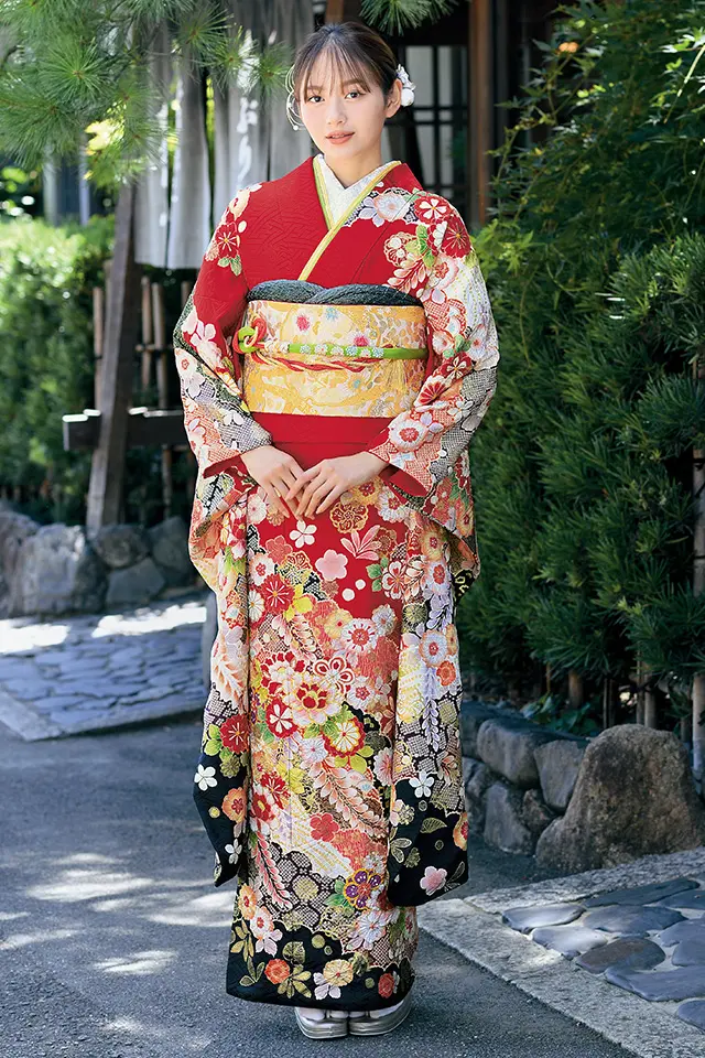 辻が花模様の古典振袖です。疋田柄の雲取り文様を背景に牡丹・菊・桜などの花々を配し、から絞りを施すことで生地に立体感と奥行きが表現され、高級感のある仕上がりとなっています。