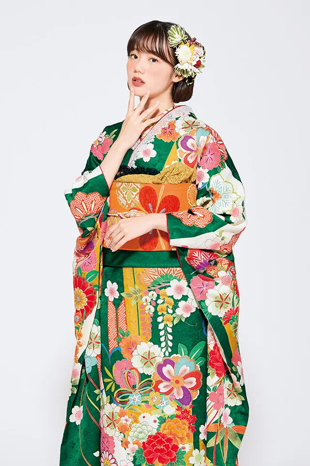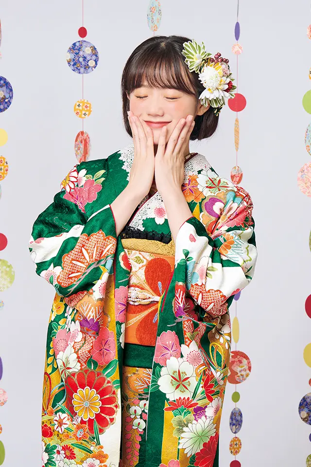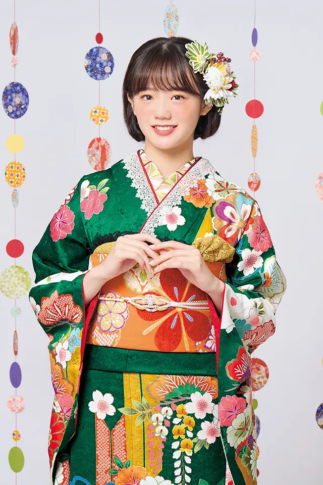 薬玉に見たてた花丸紋を中心に、明るく彩色した桜・藤・笹などの草花を散りばめた可愛らしい意匠の振袖です。緑と白に染め分けた地色と、背景に配した矢羽柄がすっきりとした着姿を演出します。