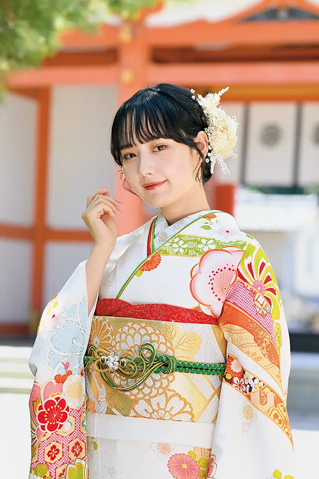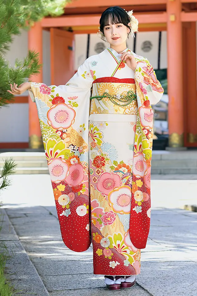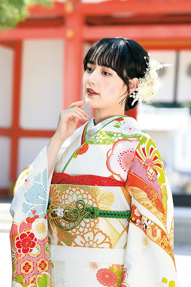 ポイントの梅柄を中心に四季の花々を配置して柔らかな印象に仕上げています。背景の熨斗目の金彩使いが上品な柔らかさを際立てます。白地に淡い優しい色遣いの配色で「上品で可愛い」を表現しました。