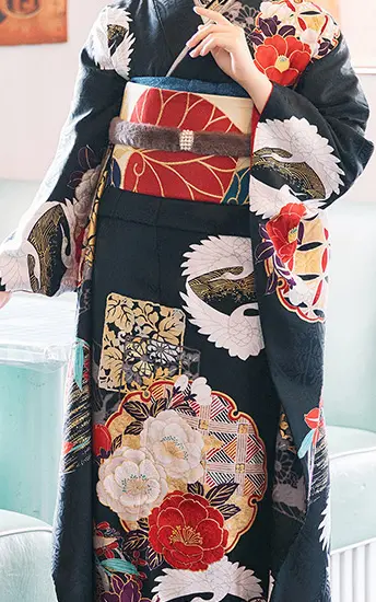 大きな雪輪の中に椿の花や亀甲、網代(あじろ)などの文様を敷き詰め、友禅と金彩加工で華やかに仕上げました。大人な黒の地色と対比的に表現された白抜きの向かい鶴が、艶やかな印象を際立たせた気品ある振袖です。