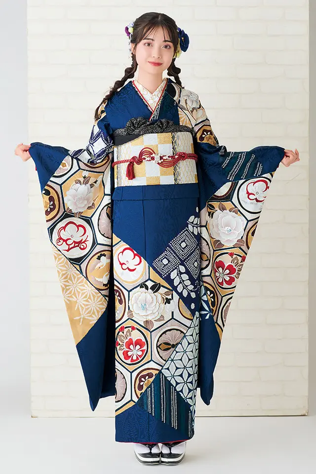 裂取り(きれどり)と呼ばれる異なる文様の布をパッチワーク風に構成したデザインが特徴の個性的な振袖です。