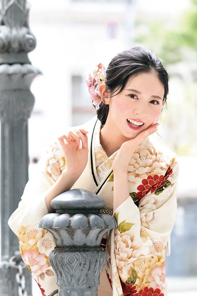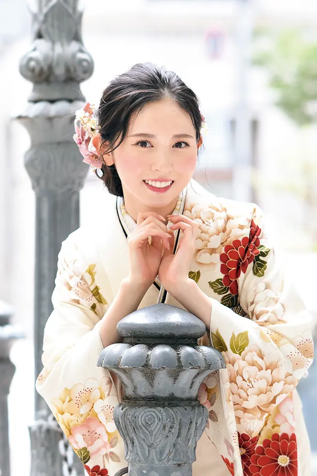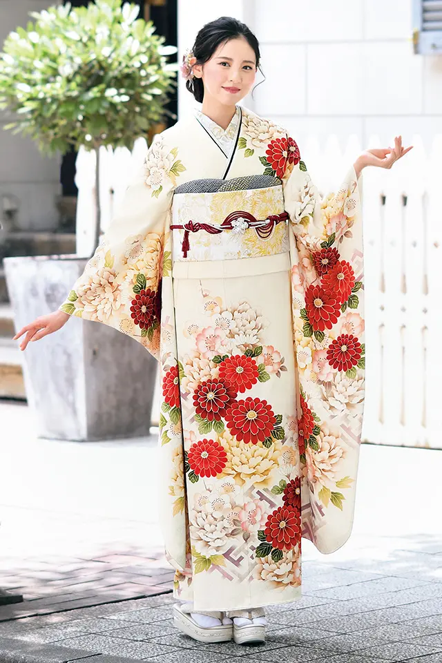 アイボリーの地色に赤系の菊を右肩山から流れる様に配した草花古典柄の振袖です。メインの花々に添えた白系の桜や牡丹の花々がボリューム感を生み出し、背景に大きく描いた紗綾形が古典美を際立てています。