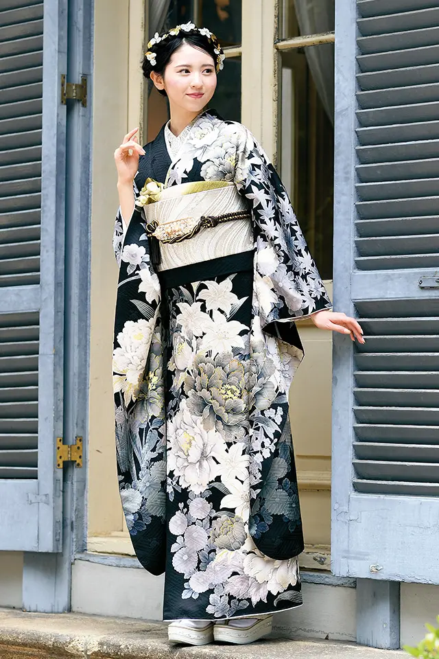 百合や牡丹といった艶やかな大輪の花のモチーフを黒や白中心の配色でモダンに仕上げました。背景には蔦を濃淡であしらい幻想的な奥行きを出しています。華やかな意匠でありながらシックな色使いでまとめた斬新な振袖です。