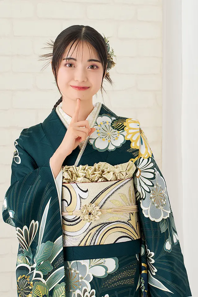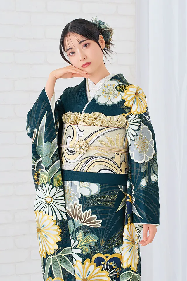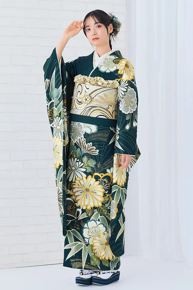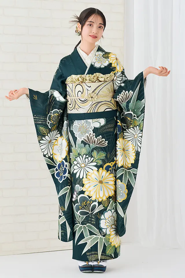 シックで上品な深い緑の地色に豪華な金駒刺繍をふんだんにあしらった菊が特徴的な現代古典柄の振袖です。松竹梅、桜など古来より伝わる縁起の良い花文様を全体に配し、シルエット風に表現された松と白く染め抜いた柄との対比を際立たせることでより高級感ある振袖に仕上げた逸品です。