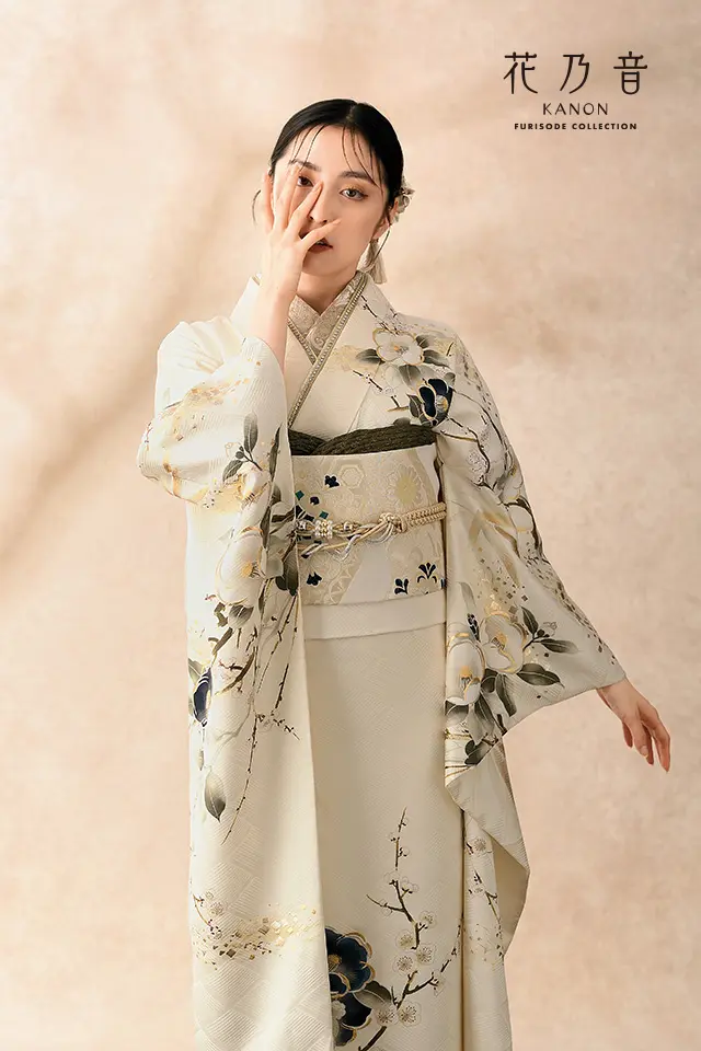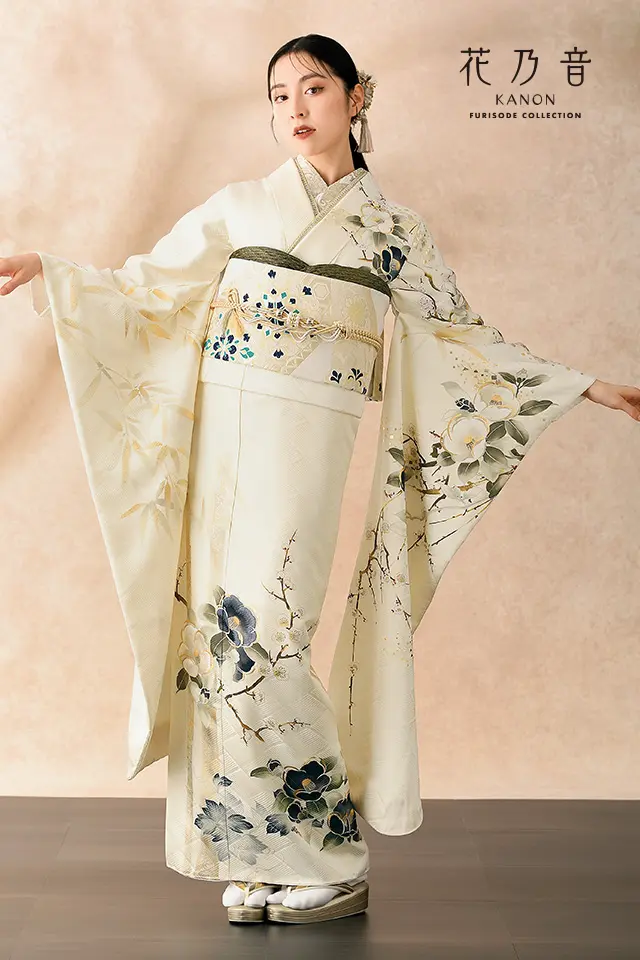 古くから縁起がよいとして日本で愛され続けている椿の花をメインモチーフに、同じく縁起の良い吉祥文様の竹・梅の柄が描かれた振袖です。日本画を思わせるような墨描調に金銀の箔使いがシンプルながら高級感を漂わせます。