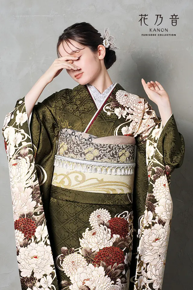 菊に流水の雅やかで格調高い京友禅振袖です。落ち着いたカーキ色の地色に白と赤の色使いが大人シックな雰囲気を演出します。