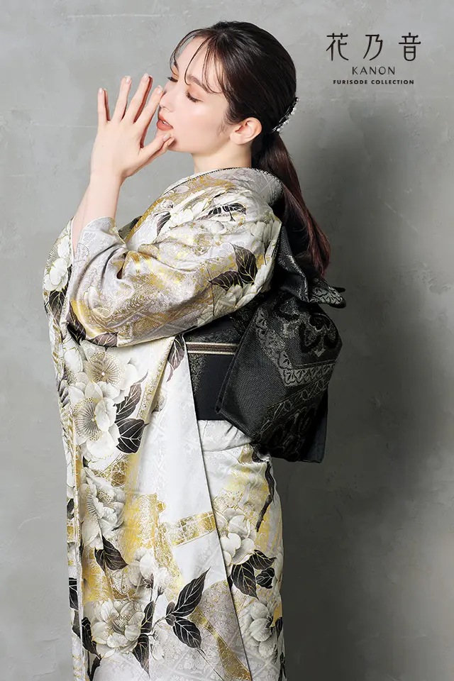 グレー系のニュアンスカラーに伝統的な紋様を組み合わせ、クールな煌めきと艶やかなオーラを併せ持つ振袖です。