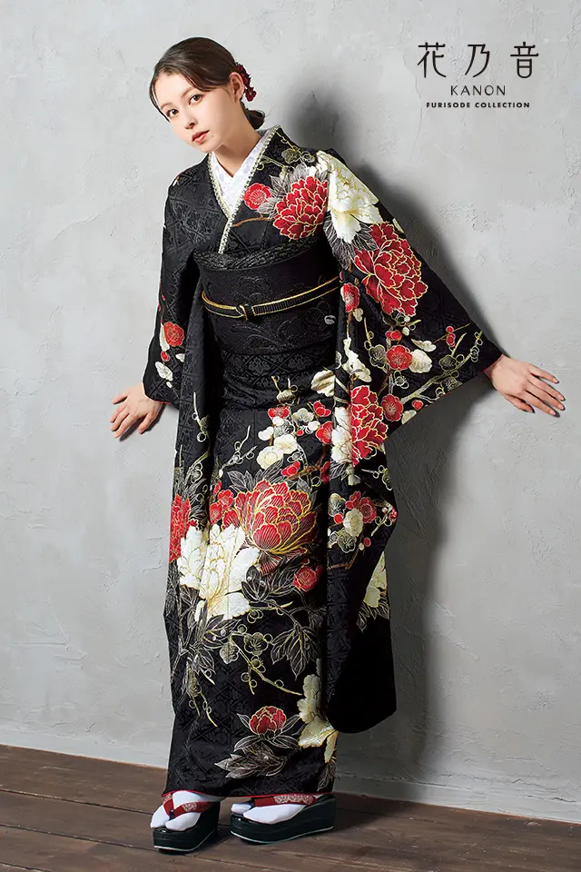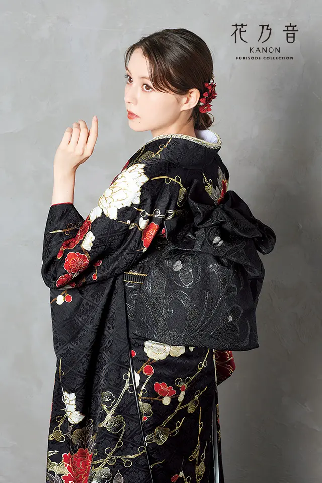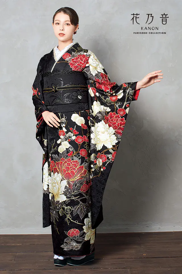 漆黒の地色に紅白の色使いの花々と煌めく金彩が着る人の新しい魅力を引き出します。
