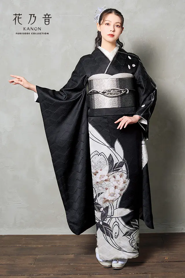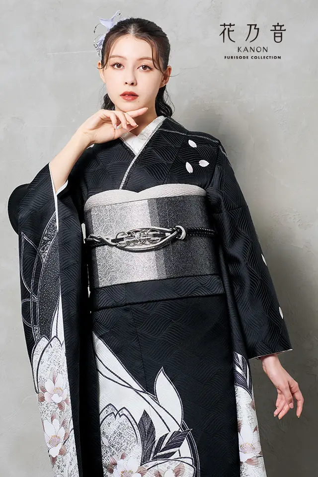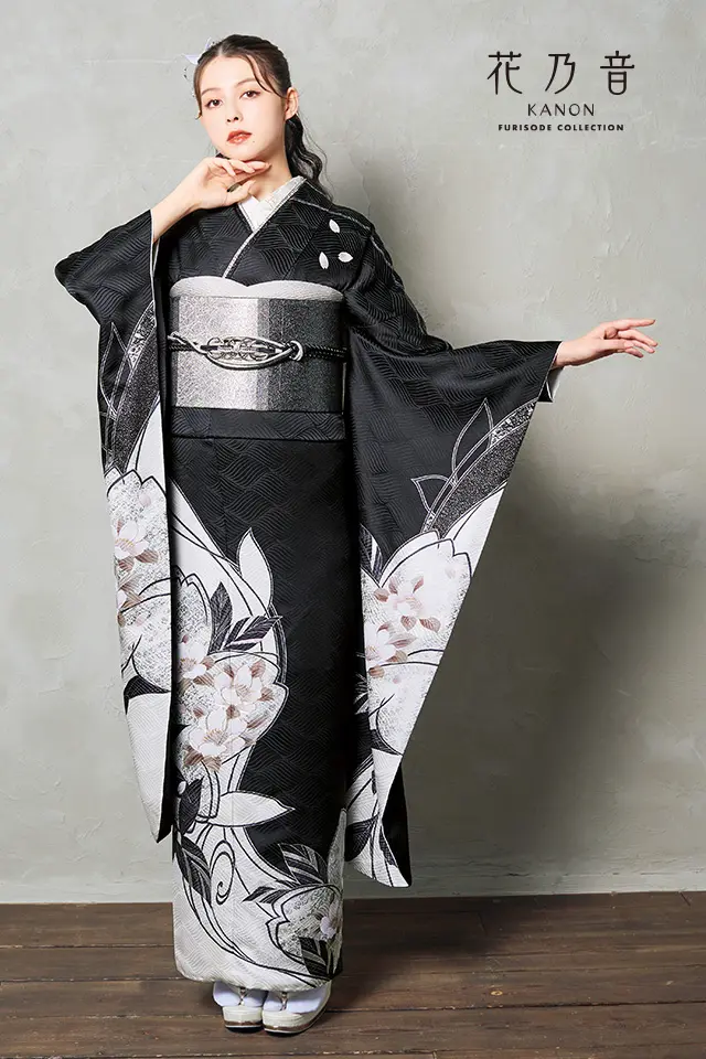 桜の花を大胆でシンプルなデザインでまとめ、白と黒で大胆に染め分けた地色が特徴的な京友禅振袖です。
