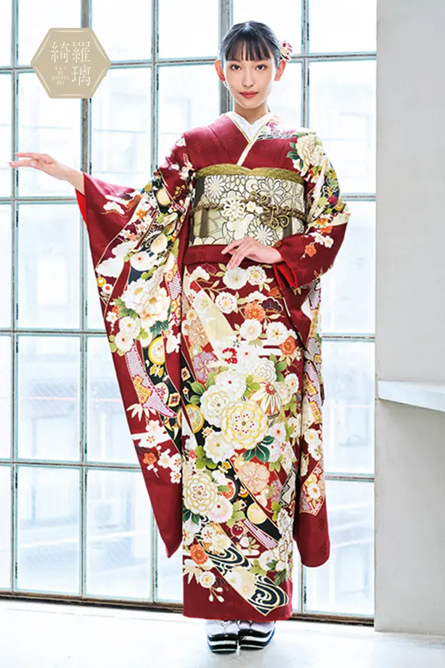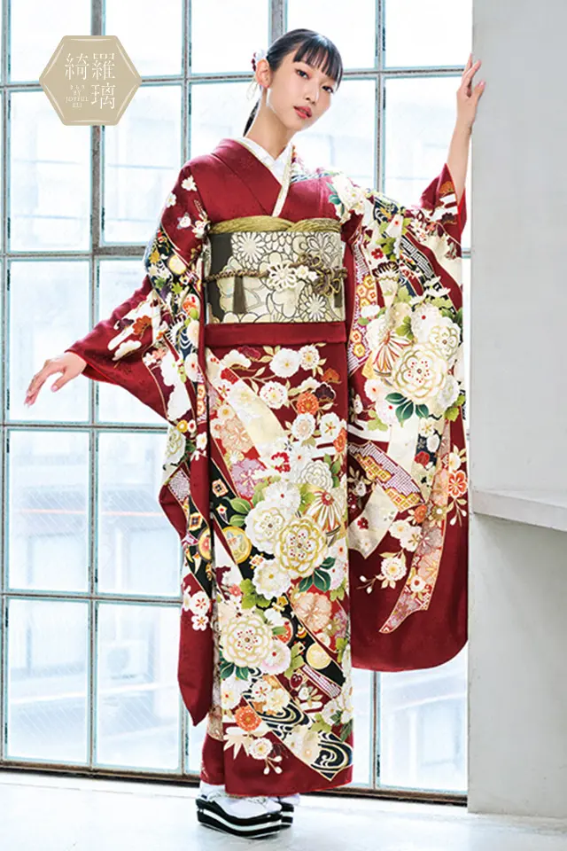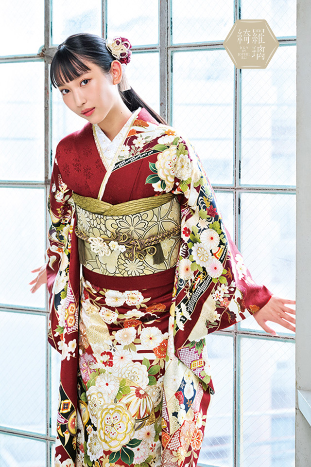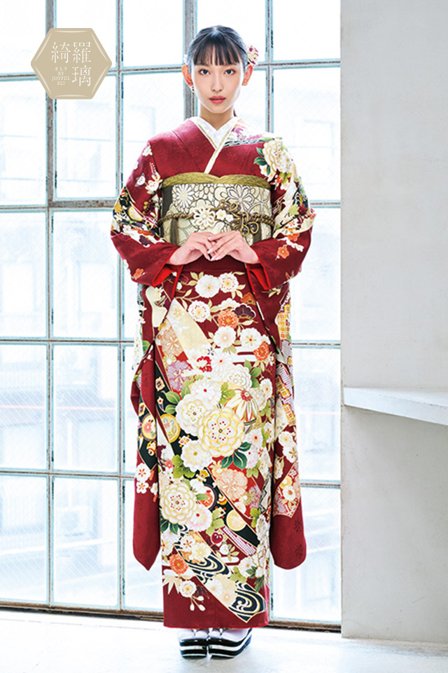 重厚感ある深い赤地に白を基調とした配色で華やかな印象に。流れるような熨斗柄に宝尽くしや草花など吉祥文様が描かれた豪華古典振袖です。