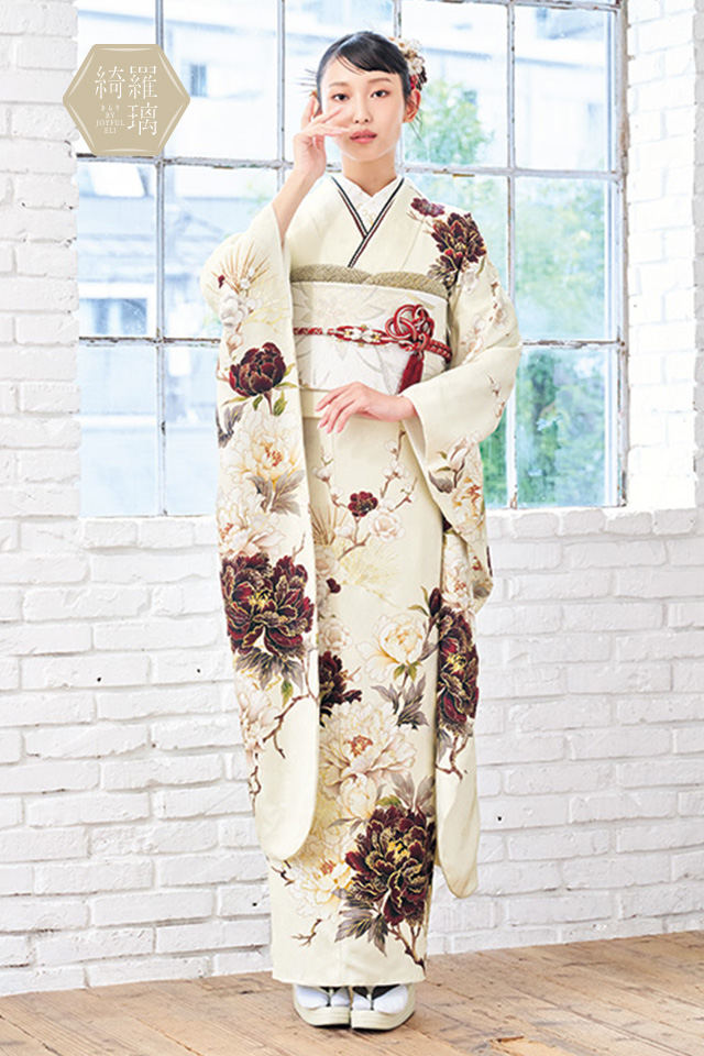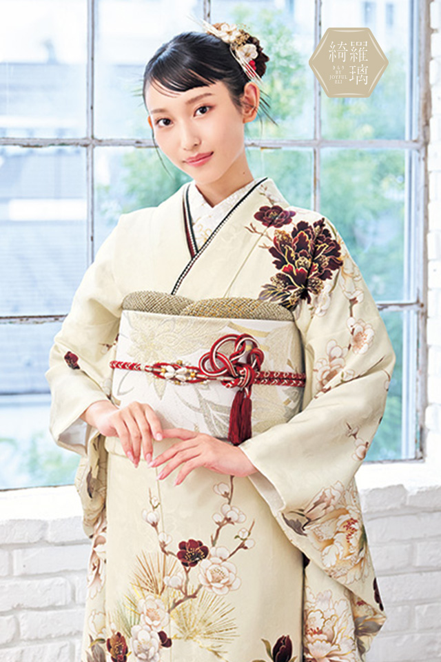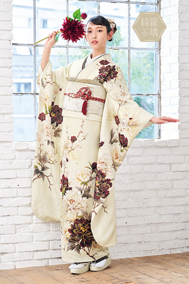 百花の王と呼ばれる牡丹に枝垂れ梅と針松ですっきり構成された振袖。色使いをシンプルにまとめスタイリッシュな印象の着姿が叶います。