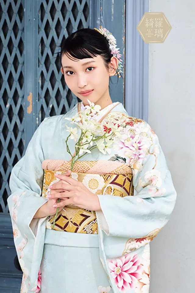 透明感あふれる淡いペールブルーの地色にソフトな色使いで上品にまとめた草花古典振袖。所々に入れた金彩が上品な華やかさ添えています。