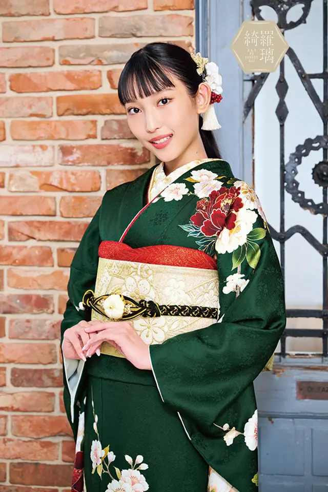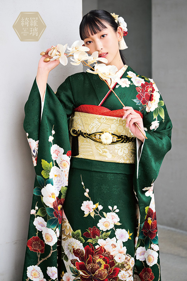 牡丹と雪輪を中心に構成された草花古典柄。深いグリーンの地色に鮮やかな牡丹の赤が映える華やかな着姿の振袖です。