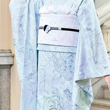 ヴェールに包まれたような淡い世界観にクリアな蝶と透明感のあるバラが舞う、瑞々しさ溢れる振袖です。控えめなシルバーの箔がキラキラと輝く着姿は、唯一無二のピュアな存在感で周りを圧倒させるでしょう。