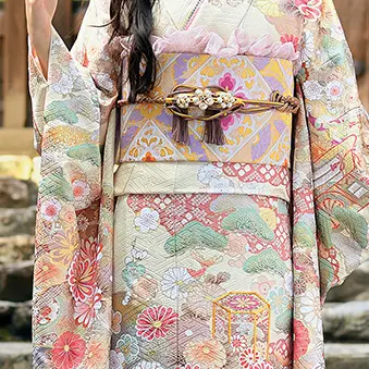 王道古典のカラーリングをソフトな雰囲気でまとめ、エモーショナルな世界観を醸し出す振袖が誕生しました。貝桶や菊、熨斗目に配した蜀江文、雲取りに扇面、松などの晴れ晴れしい柄が引き立つ豪華な柄行きです。