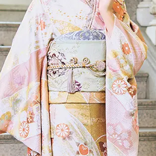 優しい色合いのピンクの地色はどこか大人っぽい印象を与えながら、あどけなさも残る愛らしい振袖です。キュートなカラーリングの御所車や牡丹、菊、桜の花々を配し、思う存分ガーリーな世界観を極めます。