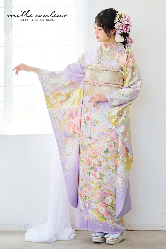 伝統的な吉祥文様をもとに創作した新感覚の古典柄振袖。格調高さとモダンさを併せ持った華やかな振袖です。ベースカラーのライラックと全体的に淡く優しい色調が透明感あふれフェミニンな印象に。