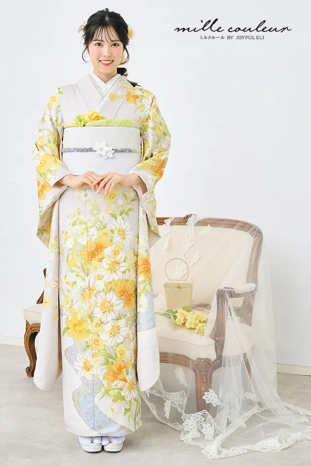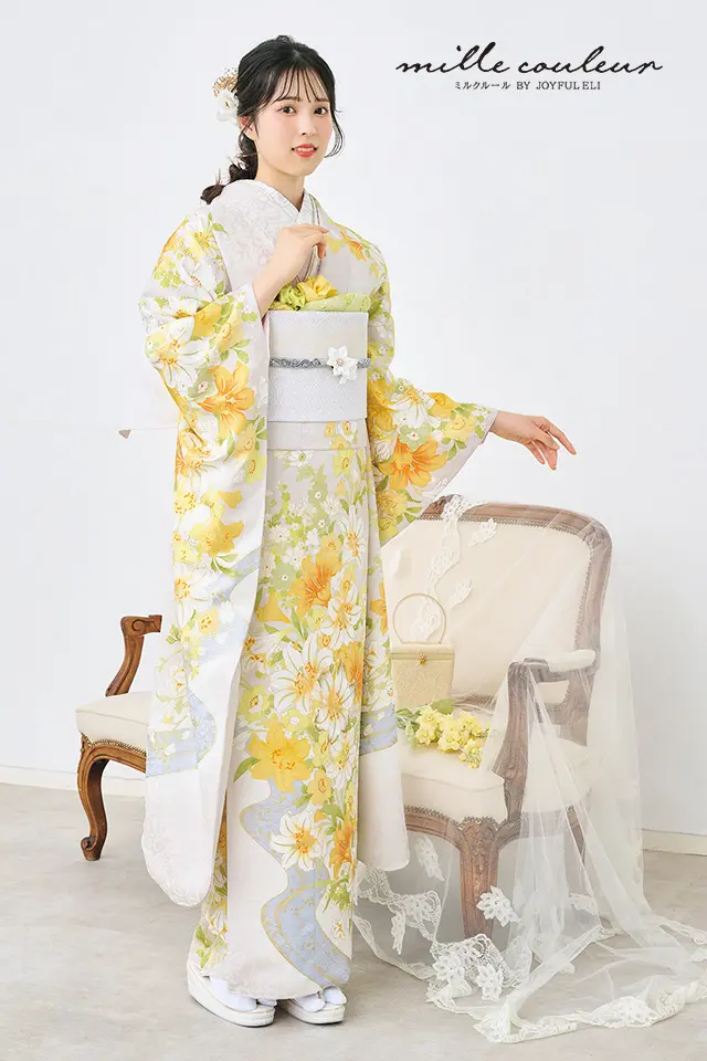 百合を中心とした花々を縦に配すことで、着姿がスッキリみえるような構図にしました。淡いグレーの地色にイエローを中心とした色調でまとめ、春のあたたかな日差しを感じさせるような優しい印象の振袖です。