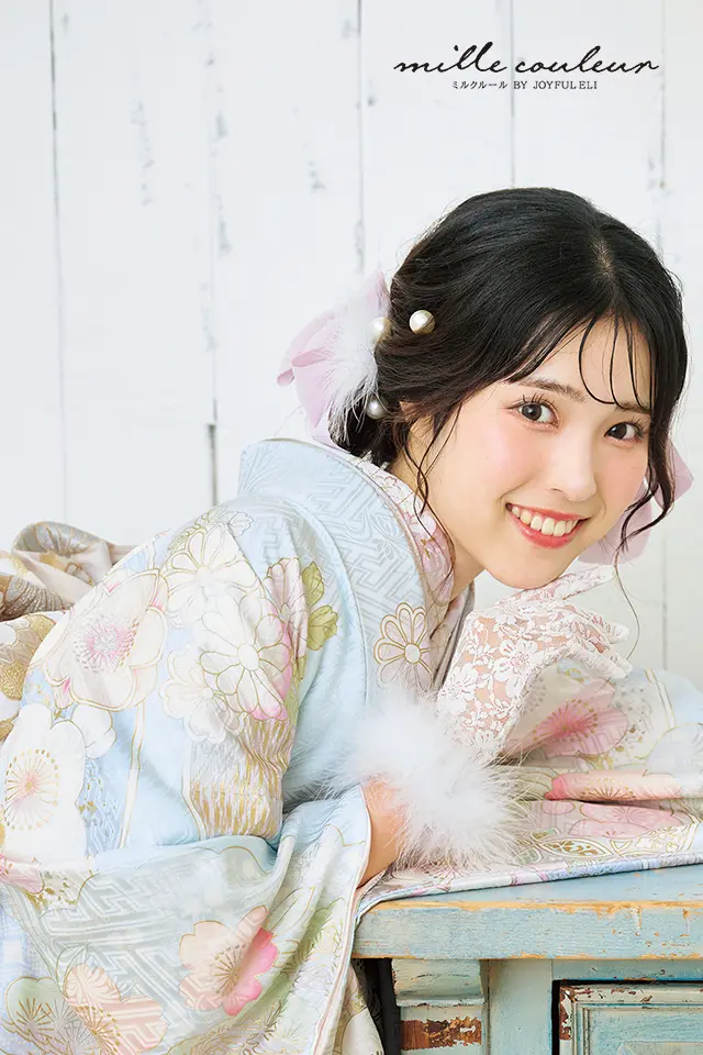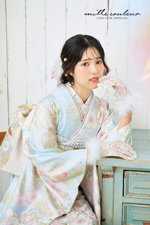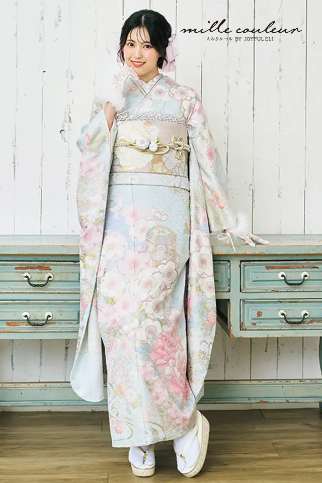 四季の草花や山取りに、存在感たっぷりに描かれた梅と牡丹が特徴の古典振袖です。はかなげな淡いブルーの地色に、白と淡いピンクの配色で全体をまとめることで透明感あふれる可憐でキュートなルックスの振袖に。