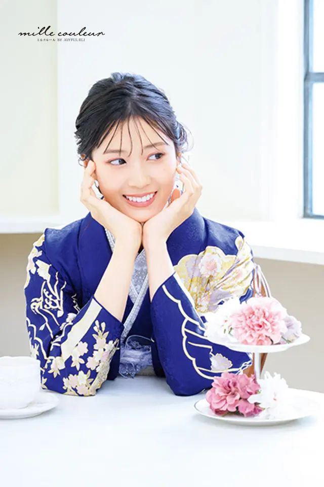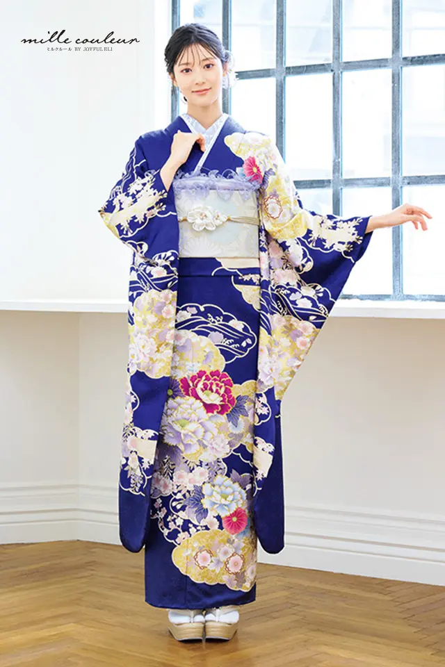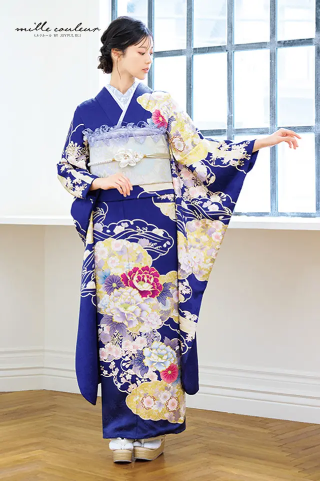 雲取りに四季の草花を配した伝統的な文様の振袖です。濁りの無い澄んだ紺の地色に白を基調とし、青や紫系の差し色で上品な華やかさを引き立てています。月夜に浮かぶ花々のように凛とした佇まいが印象的です。