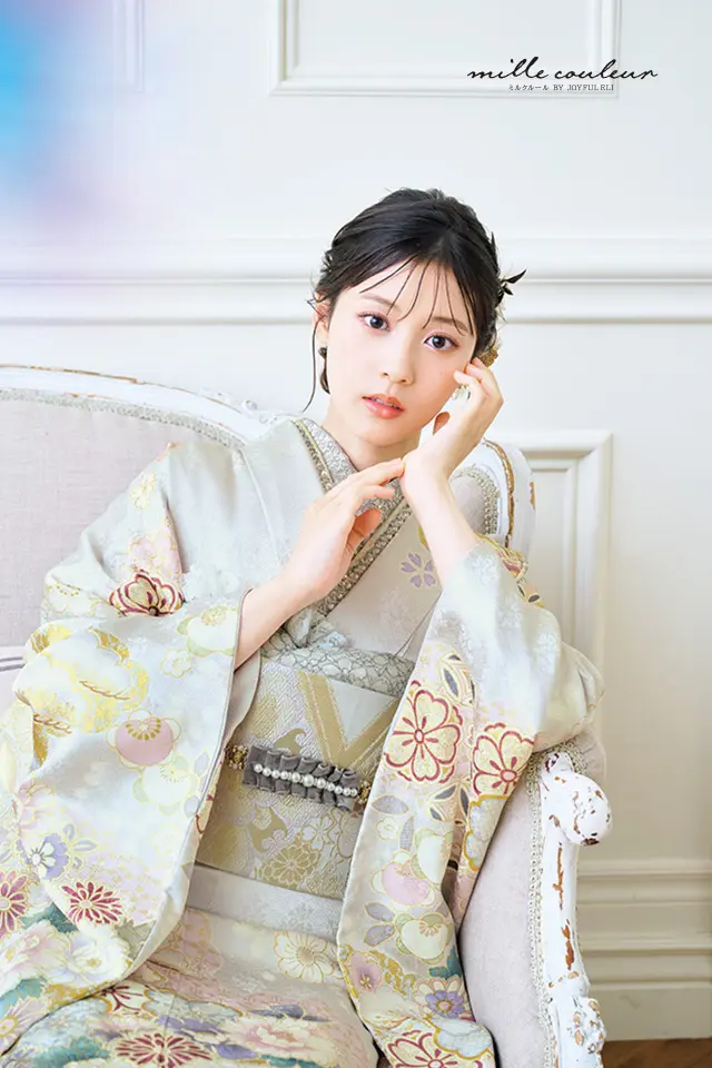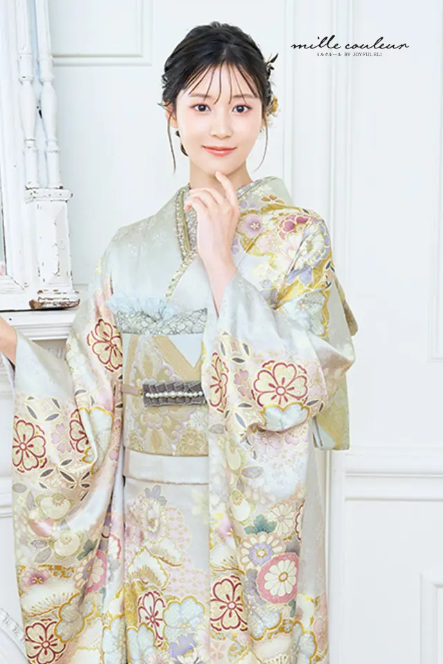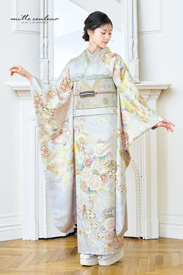 明るいパールグレーの地色に多彩な花々と辻ケ花文様を友禅職人の手技により丹念に染め上げています。白を基調としたスモーキーな色使いの彩色がチュールを重ねたドレスのように繊細で上品な振袖です。