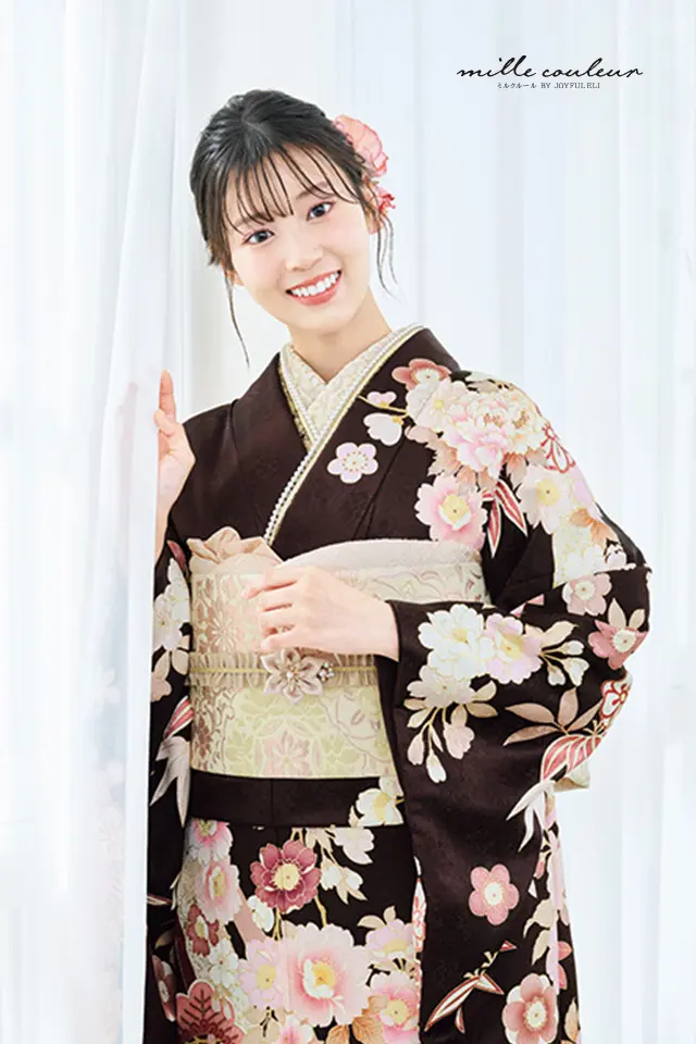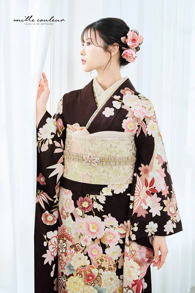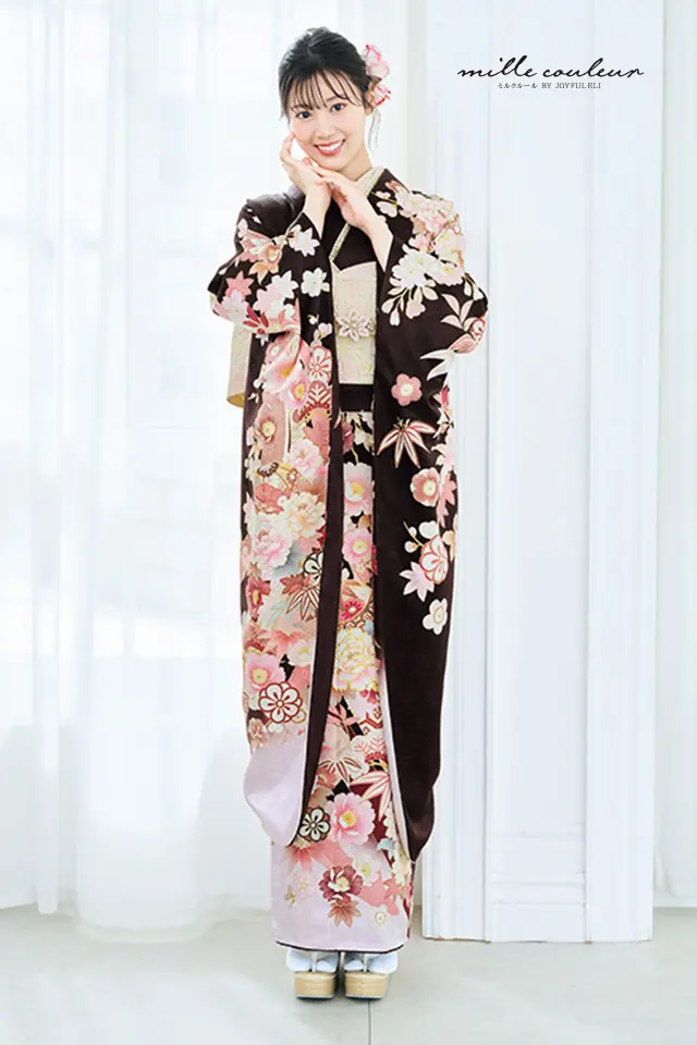 大きく流れるような熨斗目文様に牡丹や毬、桜や松竹梅などの草花文様を散りばめた成人式を彩るのに相応しい華やかな柄ゆきの振袖です。ココアブラウンの地色に甘いピンクの色使いが大人可愛い着姿を演出します。