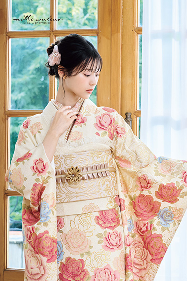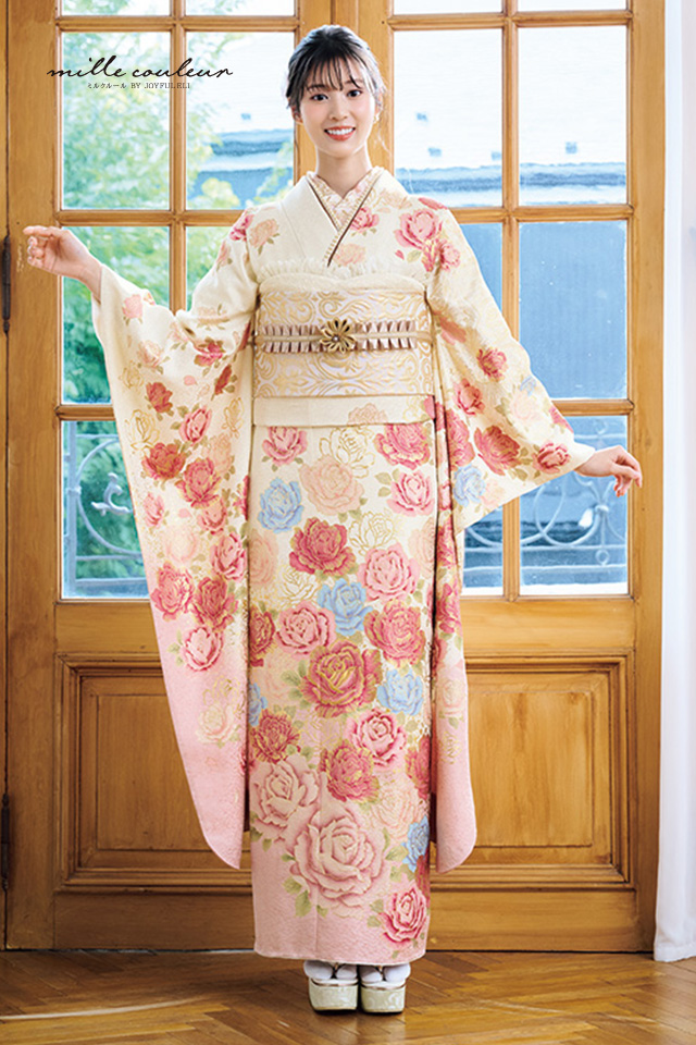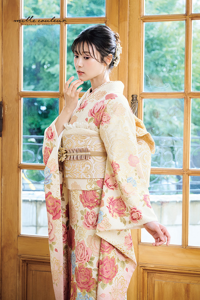 バニラの地色にピンクの濃淡とブルーをアクセントで利かせた、甘くキュートな印象の振袖です。裾から上に向かい流れるようにバラが描かれ、優美で華麗なロココ調の世界観を感じさせます。