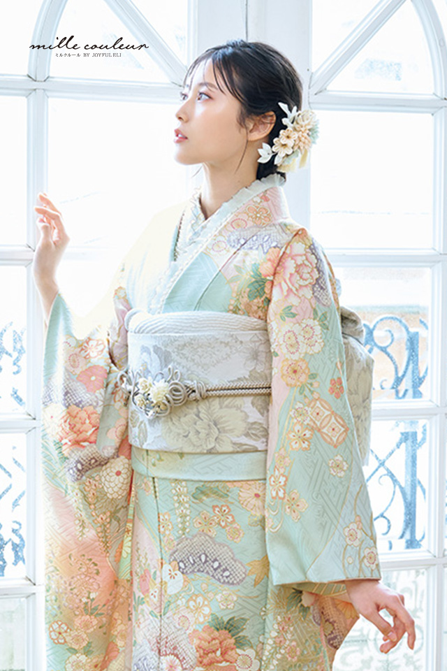 淡いミントブルーとピンクのコントラストがキュートで新鮮な印象の古典柄振袖。柔らかで優しい色調の色使いが可愛らしい着姿を演出します。身長を問わずバランスよく着こなしていただける振袖です。