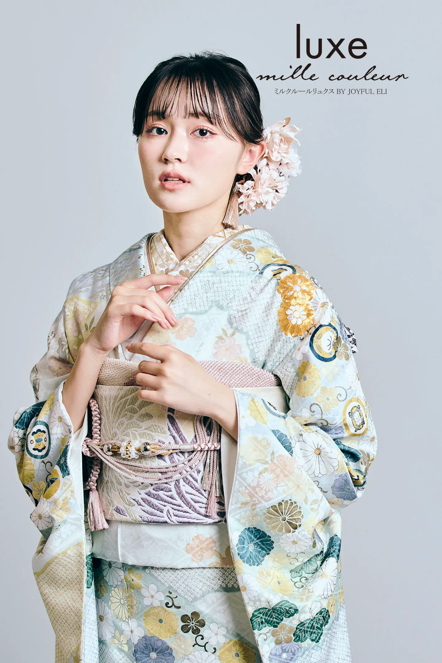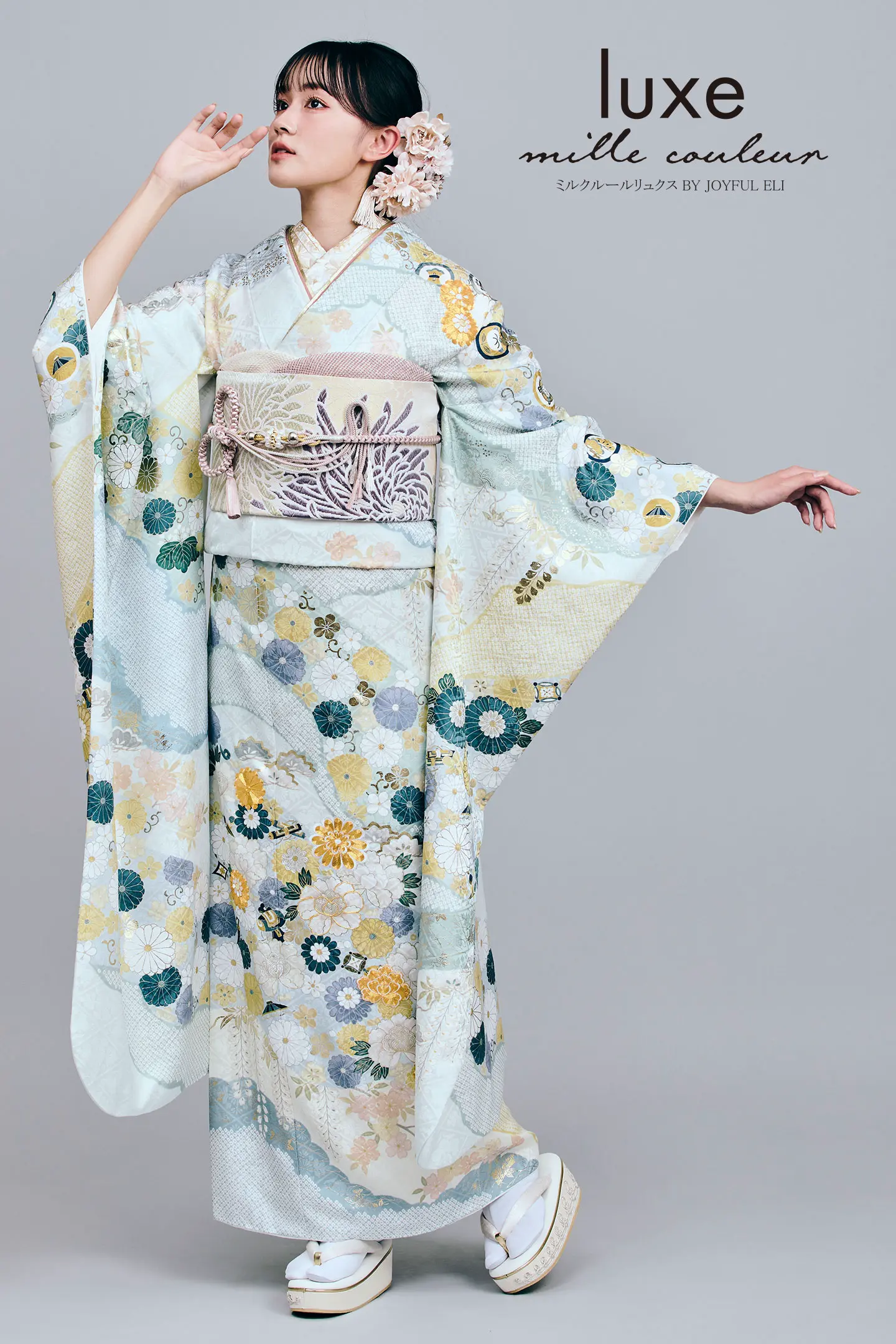 道長取りに菊の花をモチーフにした菊尽くしのデザインです。少しくすんだ淡い水色の地色をベースに、全体の配色も青系でまとめることで上品で高級感ある振袖になっています。金の駒糸を使用した刺繍が落ち着いた中にも華やかさをプラスします。