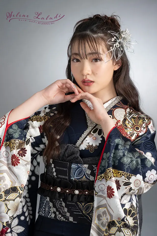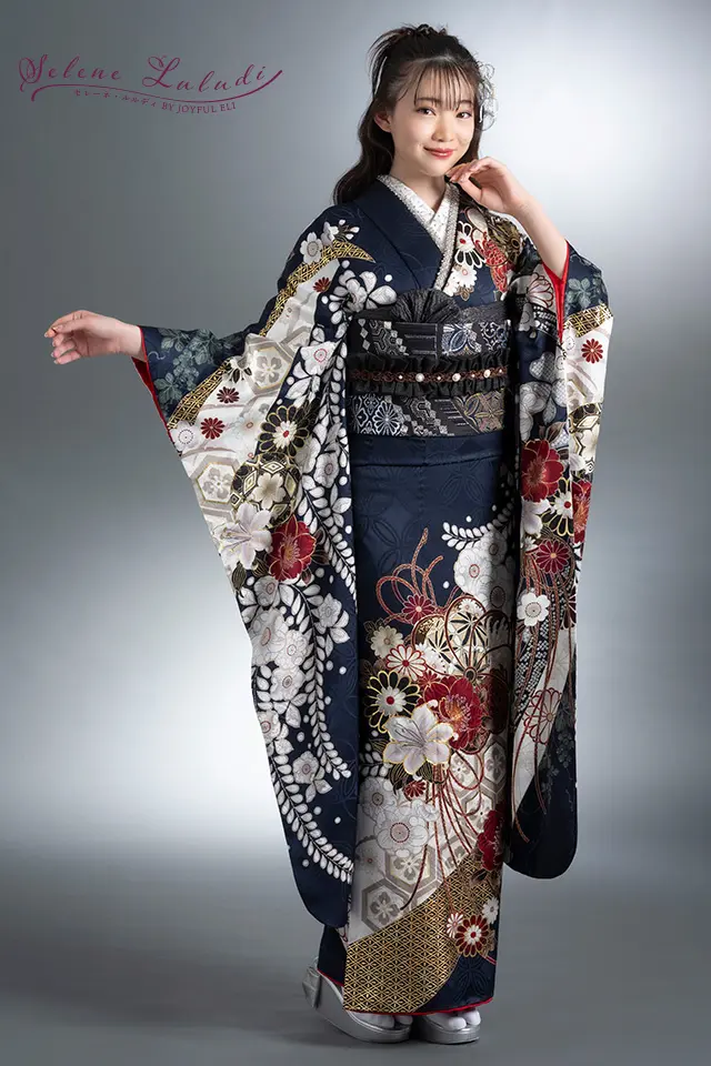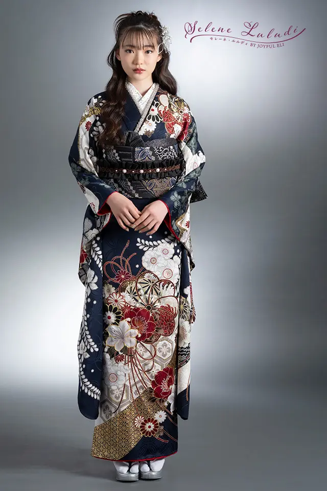 落ち着きのあるフォーマルな印象の深い紺地に、高貴な百合や縁起が良いとされる桜、菊、毬、熨斗などをあしらいました。一生に一度の成人のお祝いに相応しい古典柄振袖です。
