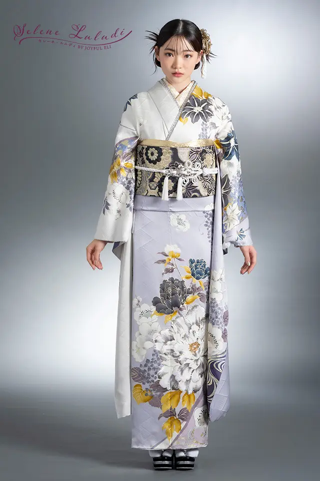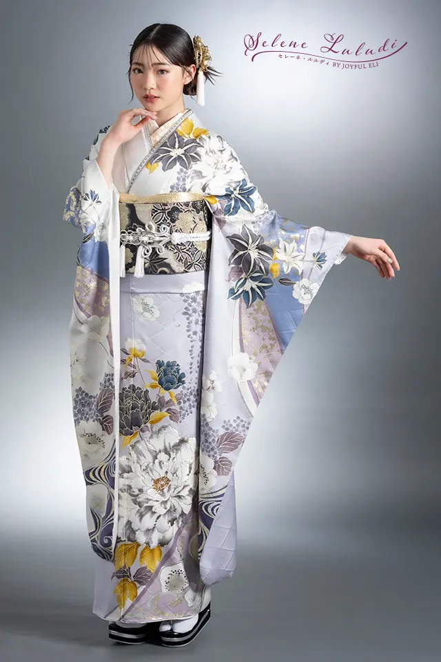 全体をなだらかな曲線と流水文様で染め分け、袖や背中になびく藤の花が流れを感じさせるデザインです。ポイントには「百花の王」とも呼ばれる牡丹が大きく大胆に描かれており優美な着姿が観る人を魅了します。