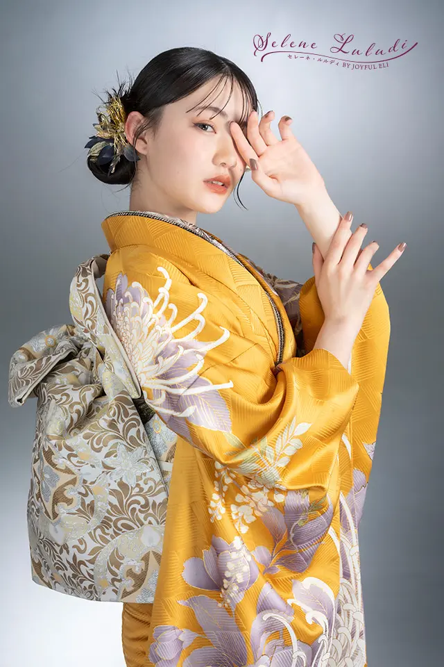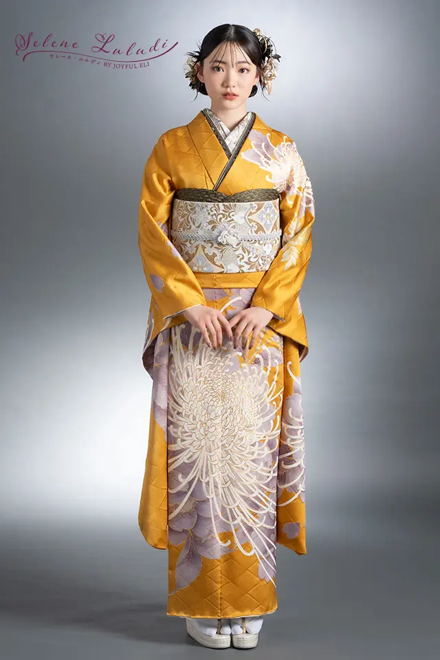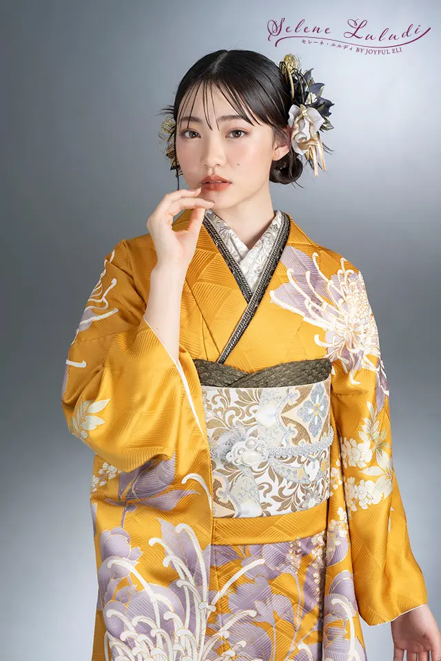 鮮やかな黄金色の地色が印象的。大きな八重桜のシルエットに白い大輪の糸菊が重なり、枝垂れる藤がアクセントで描かれています。シンプルで洗練されたデザインの振袖で着る人の個性を引き立てます。