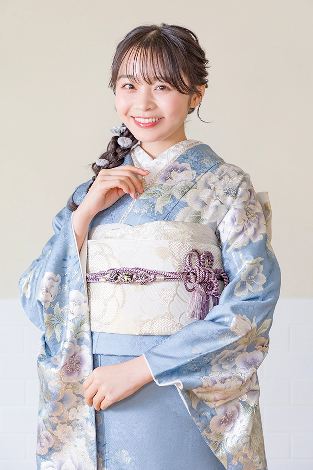 少しグレーがかったブルーの地色に、白を基調としぼかしで繊細に色付けられた花々が描かれたドレスのような振袖です。金彩の上品な輝きが高貴で上品な印象です。