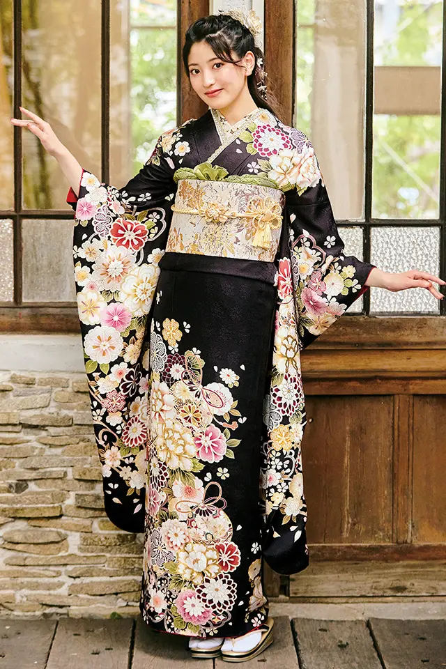 牡丹・桜・菊を大小さまざまな形や大きさで描き、ポイントの毬柄が可愛らしい印象に。ビターブラウンの地色にローズ系ピンクの配色がレトロクラシックな雰囲気の草花古典柄です。