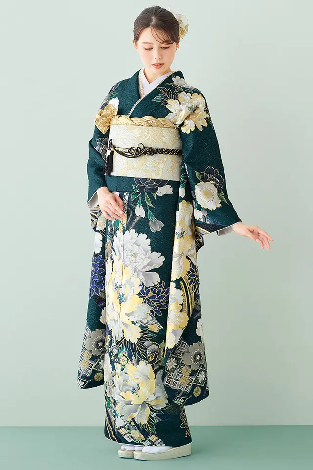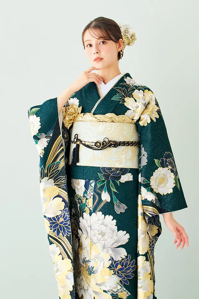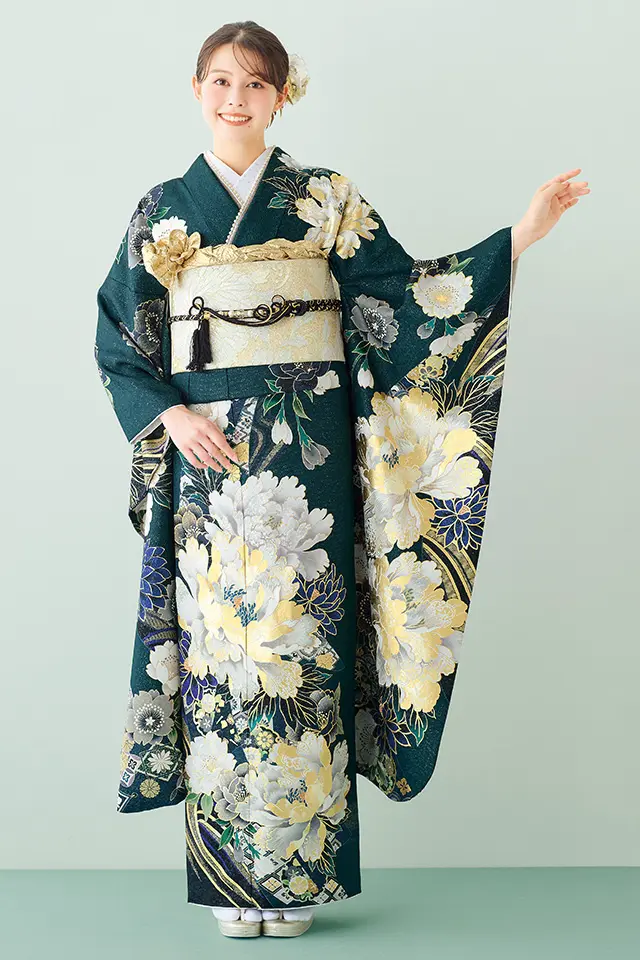 グリーンの地色に大きく大胆に描かれた白牡丹が特徴です。