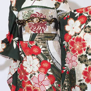 流れるような大輪の桜模様がレディライクな印象を与え、金小紋箔などの箔加工を惜しげもなく加えた、熟練の職人による格調高い振袖です。折り縫いしめ絞りなど様々な加工を使い分けた立体感が豪華な着姿を生み出します。