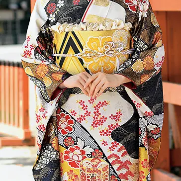 百花の王と称された牡丹を中心に春の桜や秋の菊など四季折々の花々が満開。絞りの流麗で落ち着いた色合いで大人のムード漂う振袖です。