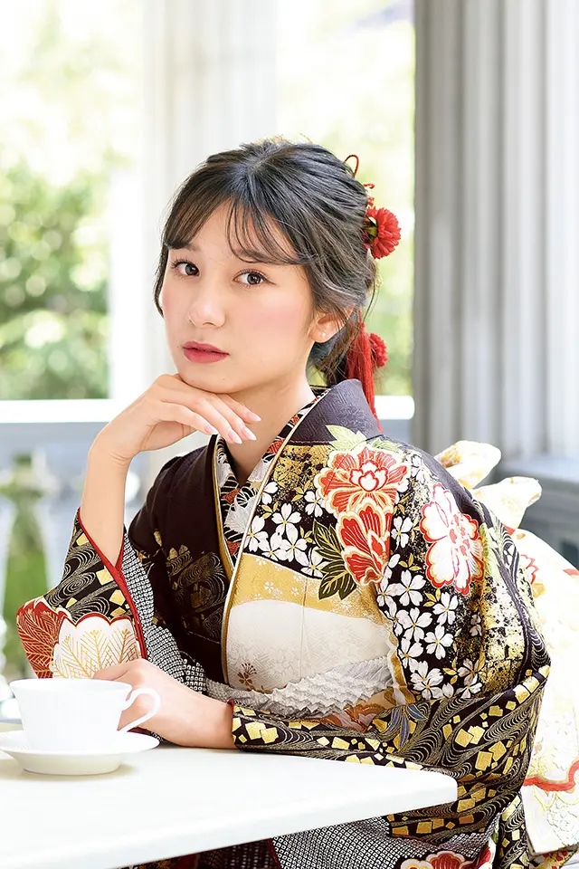 江戸時代から続く慶長模様の小袖をモチーフにした振袖です。ポイントの貝桶に四季折々の草花を散りばめ金箔をバランスよく配しました。縫い締め絞りと金駒刺繍が華やかで奥行きのある美しさを際立たせています。