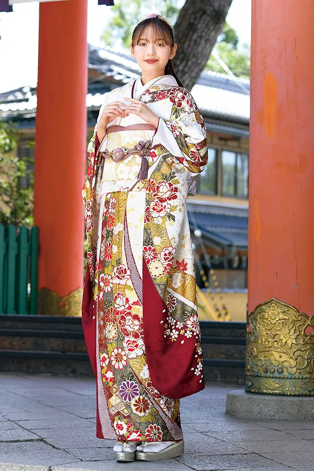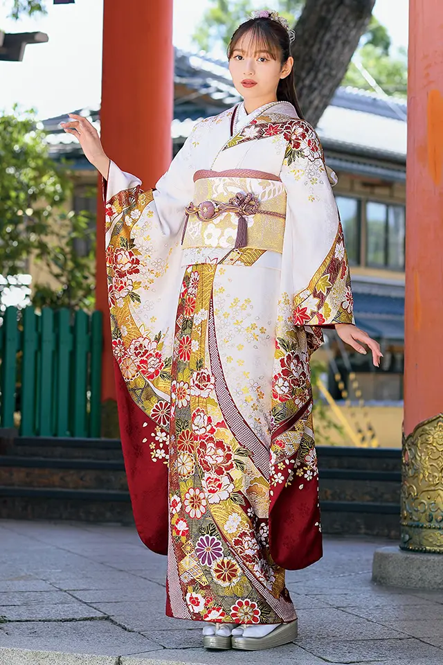 金箔や絞りといった職人の手技が光る、紅白の色使いがハレの日に相応しい振袖です。