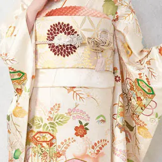 古来より格調とめでたさを表象する高貴な文様である桐文を用い、平安の王朝文化を表現する貝合せに貝桶文を組み合わせた柄行きが祝儀のシーンを雅やかに演出する明るく華やかな振袖です。吉祥文様に題材を求めながら、光沢のある国産綸子地を高度な友禅技法を用いて丹念に染め上げ、格調高い本格古典の趣ある色彩でまとめ上げています。