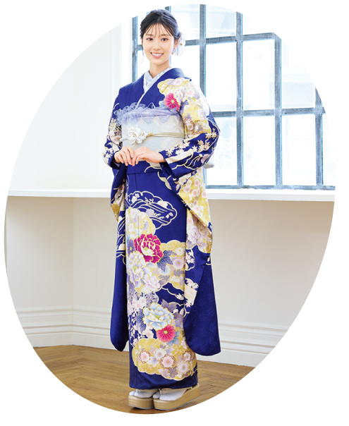 濁りの無い澄んだ紺の地色に白を基調とし、青や紫系の差し色で上品な華やかさを引き立てています。