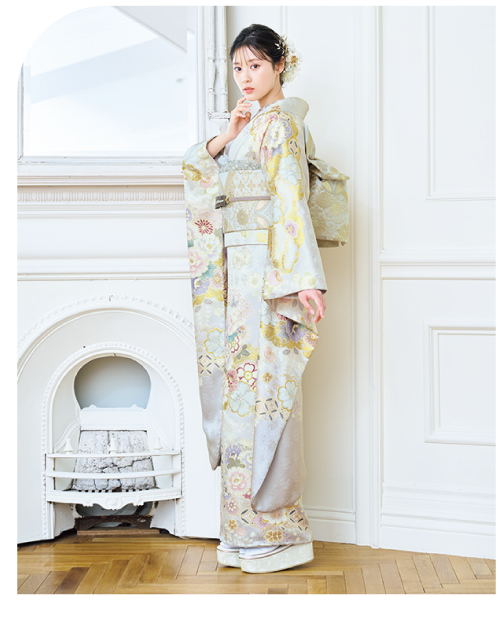 白を基調としたスモーキーな色使いの彩色がチュールを重ねたドレスのように繊細で上品な振袖です。
