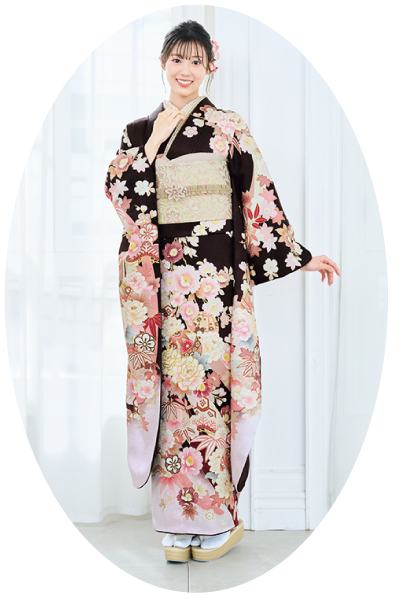 大きく流れるような熨斗目文様に牡丹や毬、桜や松竹梅などの草花文様を散りばめた成人式を彩るのに相応しい華やかな柄ゆきの振袖です。ココアブラウンの地色に甘いピンクの色使いが大人可愛い着姿を演出します。