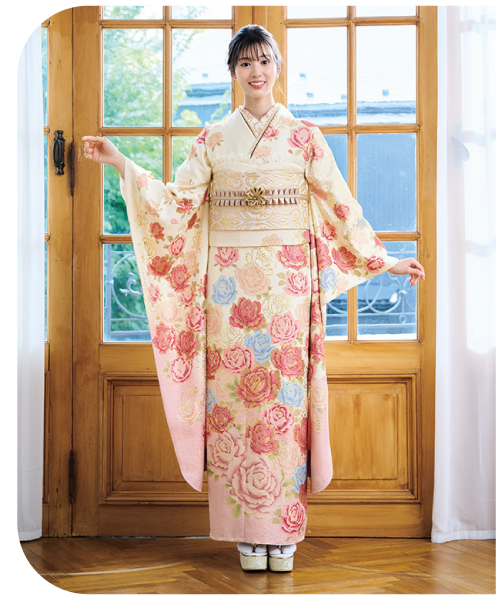 バニラの地色にピンクの濃淡とブルーをアクセントで利かせた、甘くキュートな印象の振袖です。裾から上に向かい流れるようにバラが描かれ、優美で華麗なロココ調の世界観を感じさせます。