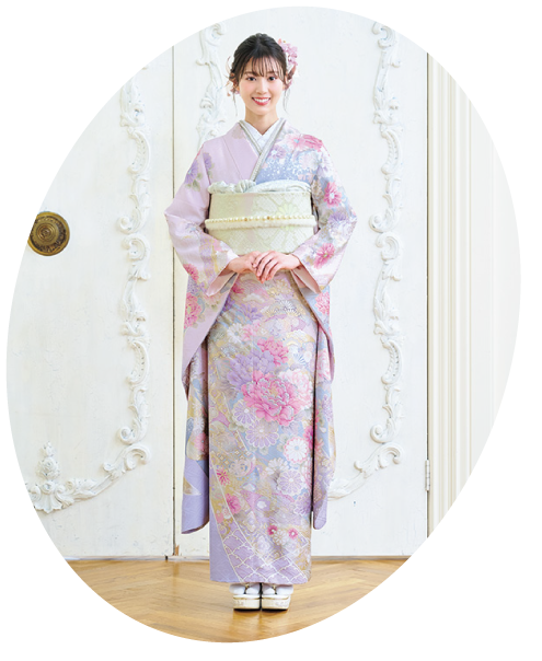 夜明け前の空を思わせるような美しいピンクのグラデーションで彩られた振袖です。重厚で格調高い熨斗目模様に全体を淡いペールトーンで優しくまとめ、全体に施した箔使いが華やかに彩りを添えています。